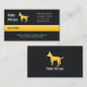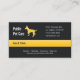 A black business card template for pet care and pet sitting services. It is also suitable for veterinarians or pet clinics. The template design shows the company name and a dog silhouette on the upper left side. To the right of the company name and dog silhouette you can find all contact details. Services and a Slogan are placed on the bottom of the business card.
