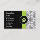 Pet care business card in a fun and elegant design with paw print and damask pattern background. Chnagte the text with your own business info for any business card theme related to dogs, cats, pets, pet health, or veterinarian services.