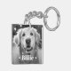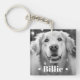 Photo keychain featuring your custom pet photo with with the pet's name as a white text overlay flanked by two hearts.