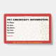 Attach this card to your pet's travel crate or harness, or some visible location in the car. This card may help if you are in an accident or otherwise unable to make care decisions for your pet. Be sure that the people you name know that you have listed them. Personalise this badge for your pets in case of emergency. Be sure to include any important medical information. Use the Customise feature to add more fields, contacts and other text as desired. And remember - this card is credit card sized so don't make the text too small.