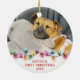Create a personalised commemorative keepsake photo holiday ornament for a pet's First Christmas (or other custom text) featuring colourful Christmas holiday lights and your custom text. The design is duplicated on the back with your choice to add a different photo. The sample shows NAME'S FIRST CHRISTMAS and Year. OPTIONS: The sample is shown on the round ceramic ornament--other ornament styles are available on the ordering page. ASSISTANCE: For help with design modification or personalisation, colour change, resizing, transferring the design to another product or if you would like coordinating items, contact the designer BEFORE ORDERING via the Zazzle Chat MESSAGE tab below or email makeitaboutyoustore@gmail.com.