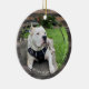 A true keepsake for your pet features 2 circular grunge photos on dark wood print ceramic ornament.