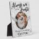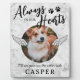 Elegant pet memorial keepsake plaque featuring a faux marble background, the title 'forever in our hearts', paw prints, a photo of your beloved pet dog or cat, angel wings, their name, and the sympathy saying 'I'll see you on the other side'.