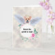 A pretty round watercolor faux gold wreath edged with eucalyptus leaves and floral pink roses has the face of a Pembroke welsh corgi dog peeking over the top edge. The dog has long, extended angel wings and a faux gold halo and is looking down on the wording; heaven has gained an angel. The inside has the poem called "A bridge called love"