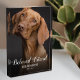 Modern pet memorial photo block featuring a photo of your beloved dog/cat, and a black overlay with white text.