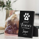 Custom pet memorial picture plaque featuring a photo of your beloved animal, a paw print incorporating a heart, a sweet saying, their name and the dates.