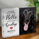 Modern pet memorial photo block featuring a photo of your beloved dog/cat, a red heart with a paw print centre, the saying "you were my favourite hello and my hardest goodbye", their name, and dates.