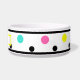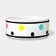 Polka Dots Personalised Pet Name bowls. Colourful geometric polka dots with black border trim and pink, yellow, turquoise, black dots against white background. Personalise pet's name in bright sunny yellow rectangle frame with text in black. Bright, fun fresh trendy circular shapes. Click to personalise and customise dots colours, if you wish. Original artwork design by TamiraZDesigns. www.zazzle.com/tamirazdesigns