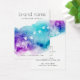 Earring jewellery product display card with your brand in a modern script font and a purple and aqua blue watercolor splash with a white paw print animal track. Customisable text and logo on the back.