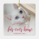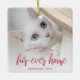 Commemorate your pet's first Christmas in her new home with this beautiful modern keepsake ornament. The text reads "First Christmas in my fur-ever home," with the words "fur-ever home" in elegant pink faux foil script. Replace the sample image with a photo of your cat or dog and add her name and the year in pink sans serif font. A white gradient filter helps make the text pop.