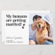 Let your Best Dog announce your wedding with this modern and elegant 'My Humans Are Getting Married' pet dog save the date postcards. These budget wedding invitation cards have an envelope option. Customise with your favourite engagement photo, dog's photo, or photo with the dog , and personalise with names, date, and wedding location. These dog wedding invitations are a must for dog lovers and dog moms! COPYRIGHT © 2020 Judy Burrows, Black Dog Art - All Rights Reserved. Pet Photo Wedding Dog Save The Date Cards Budget