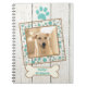 Keep your dog care notes and record keeping together in one notebook with this custom pet photo and title template on front. It has a white weathered wood background, ocean green paw print, and polka dot frame with brown edge. White bone with your own title under photo.