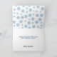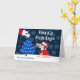 This cute holiday card is for your pet sitting, dog walking, or any pet-related business. A little dog in a Santa outfit is sitting in the snow while Santa puts a star on top of a blue Christmas tree with blue lights. There are snowflakes falling. The front text says "Happy Holidays" and below says "from your pet sitter." All text is fully customizable.