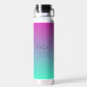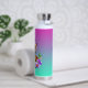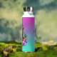 Personalised water bottle. Pretty watercolor style ai art with a cute tabby cat surrounded by pink and purple flowers. Quote on the back says, "Petals n Purr". Purple and teal.