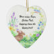 This design features a brown bunny as Peter Cotton Tail. He is sitting in a bed of greens and flowers shaped in a horse shoe. The flowers in blue, green, purple and yellow are in bloom and at the top is a bird perched on a vine of flowers. These ornaments are dated on the reverse side on some styles. Put all your own information on this ornament. Available in assorted styles.