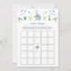 The BEATRIX Peter Rabbit baby shower bingo game design features a white background with watercolor Peter Rabbit with elements from the garden, and a combination of serif and sans serif fonts in blue. The centre square is a carrot. This baby shower bingo game template is the perfect choice for a Peter Rabbit baby shower game.