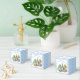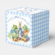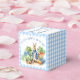 Peter rabbit with a blue jacket and garden vegetables baby shower favours personalised favour box template. A cute bunny in a blue jacket standing in veggie garden for a baby boy baby shower pastel blue gingham favour boxes suitable for candy almonds nut favours, can fit about 20 coated almonds