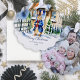 Peter rabbit winter themed Christmas photo greeting card ornament, a cute bunny in a blue jacket in front of snowy winter cottage unique Christmas greeting cards