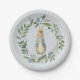 Watercolor Peter Rabbit bunny in a blue jacket surrounded by hand-painted watercolor flowers, berries and foliage. These plates would be adorable for a baby shower or child birthday party.