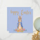 Peter the Rabbit on a Blue Background with easter eggs. "Happy Easter" text in gold.