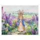Peter the Rabbit with a watercolour field of lilacs and wild flowers.