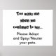 Too Many Die...Adopt Spay/Neuter poster: Pet overpopulation is a serious problem throughout the world. Does it break your heart to see dogs, cats and other animals bred and sold in pet stores when there are so many pets in animal shelters that need homes? Does it trouble you to see unwanted puppies and kittens born because of people who didn't want to bother with getting the mama and papa dogs, cats and any other animals spayed and neutered? Well this design is for you! Text is "Too many die when we continue to buy... Please Adopt and Spay/Neuter your pets.".