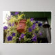 a soft sketch textured hanging basket of purple petunias in bloom along side the dinner bell.