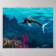 Vista submarina de un pez espada rondando en las profundidades. Ilustración digital.