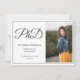A vertical photo announcement for a PhD graduate. This design has grey letters with the word PhD in a script font and a white background (the paper is currently set to a shimmer paper type to give that background more emphasis). The photo is a template that is meant to be swapped out for your own. All the words can be customised.