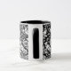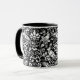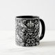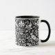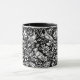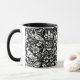 Mug in a William Morris, Art Nouveau wallpaper design of pheasants and hares set among leaves, vines and flowers - subtly textured white on a black background