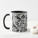 Mug in a William Morris, Art Nouveau wallpaper design of pheasants and hares set among leaves, vines and flowers - Black on a subtly textured white background