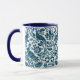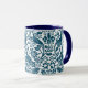 Mug in a William Morris, Art Nouveau wallpaper design of pheasants and hares set among leaves, vines and flowers - dark Indigo / navy blue on a white background