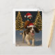 A pheasant enjoying the Christmas truce and having fun riding a liver and white Springer Spaniel in the snow with twinkling Christmas trees in the background.