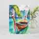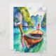 This postcard features a watercolor painting of a long boat floating through the Phi Phi Islands in Thailand.