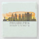 Stylish and modern stone coaster features Philadelphia Pennsylvania city skyline silhouette with sunset watercolor splash background and latitude & longitude map coordinates on pale blue background. Great for your own home or as a Philly keepsake for others.