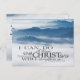 Christian inspirational quote scripture postcard depicts a nature photograph with blue mountains coved with a foggy cloud. It features Bible Verse Philippians 4:13, "I can do all things through Christ who strengthens me." The greeting can be customised or deleted for a hand written note.