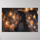 Detailed anime painting of a beautiful young woman reverently wandering through a dark room filled with hanging lanterns.