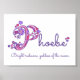 Pretty P lettering monogram art name poster perfect for a girls bedroom or playroom in shades of pink and purple. Personalise with your own name beginning with P, and name meaning for a truly personalised touch to your girl's bedroom or nursery. This poster reads name Phoebe Bright radiance, goddess of the moon. Cute poster print ideal for a new baby, christening or baby shower gift. © Unique letter P monogram hearts and flowers drawing and graphic art design by Sarah Trett. www.sarahtrett.com for www.mylittleeden.com