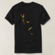 A graceful phoenix burns brightly on this t-shirt, golden fiery feathers falling from it.