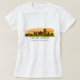 Women's T-Shirt features Phoenix, Arizona city skyline silhouette with sunset watercolor splash background and latitude & longitude map coordinates.