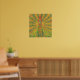 Poster featuring fantasy artwork. Sun bird with the feminine human face, sun shining in yellow, orange and drops of green as background. Inspired by the legends about sun gods, Phoenix bird and Fire bird from Russian fairytales. Pastel painting, surreal art, pop-surrealism.