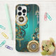 Jewellery, gold watch with a gold chain and keys on a green textural background. Steampunk style.