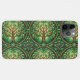 Phone case with an intricate green and brown leaf pattern, featuring circular designs and floral elements. The style is vibrant and nature-inspired.