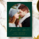 This simple, minimalist Save the Date card features a boho photo arch above the words "Save the Date" in elegant gold foil handwriting script, followed by the couple's names, wedding date and city in sans serif font on an emerald green background. Add a more detailed message with additional information on the reverse.