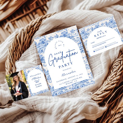 An elegant graduation celebration design featuring a delicate blue toile floral border inspired by classic European porcelain and vintage botanical prints. The intricate florals frame a clean arched center panel, creating a refined and timeless composition that highlights the graduate’s name and event details beautifully. Soft blue tones against a crisp ivory background give the design a sophisticated yet celebratory feel. Perfect for a stylish graduation gathering with a classic, romantic aesthetic.