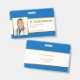 An elegant badge intended for a doctor or nurse (but can be also used for other employees). On both sides it has blue background and a white stripe with faux gold foil borders and golden texts inside. On the front it also has a photo in a faux gold foil frame, on the left, over the white stripe and the name - the first line of text - is written in bigger golden letters.