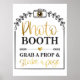 You will love this black laurel wreath with an arch and golden heart and a camera in white and gold calligraphy writing saying photo booth grab a prop and strike a pose.