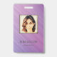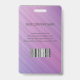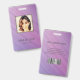 Modern photo business ID identification card with barcode over a purple and pink diagonal stripes background. Additional information can be added to the backside of this business ID badge