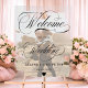 Simple minimalist elegant white calligraphy script wedding welcome sign, add your photo with a white overlay on transparent acrylic background.
