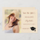 On front: Add your own vertical size photo of the graduate. A modern champagne colored background, mocha colored text. Templates for a name and date. The name and the text: Save the Date are written with a modern hand lettered style script. With a cap, tassel topper.